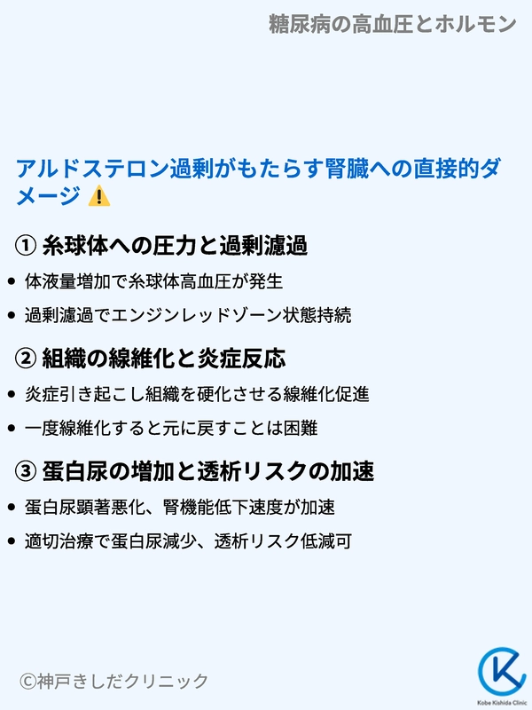 アルドステロンの過剰分泌は、糸球体への物理的な圧力だけでなく、直接的な組織の線維化や炎症を引き起こし、糖尿病性腎症の進行を加速させる独立した危険因子です。