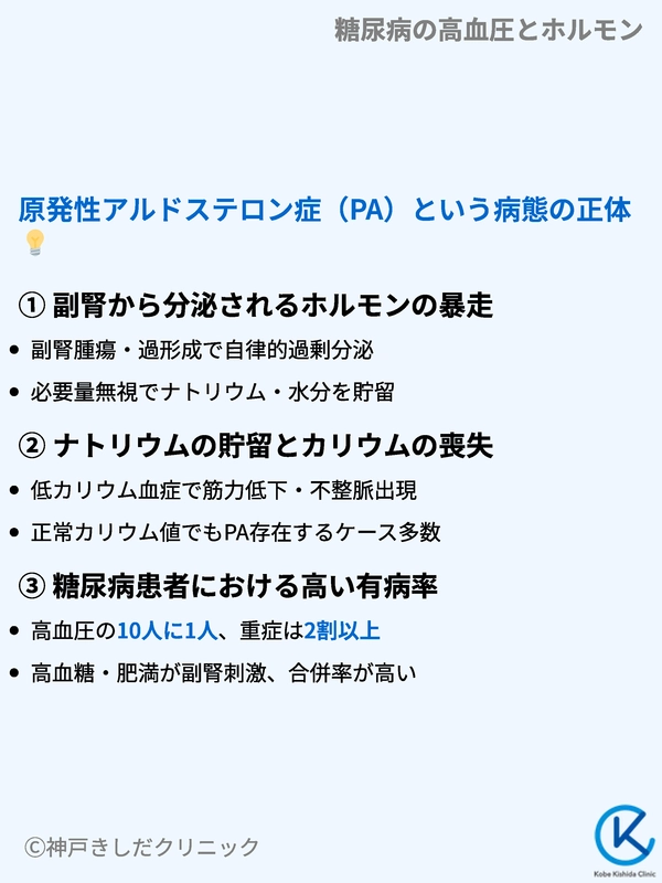 原発性アルドステロン症は、副腎からのホルモン過剰分泌により、制御不能な高血圧とカリウム喪失を引き起こす病態であり、糖尿病患者において高い頻度で合併します。