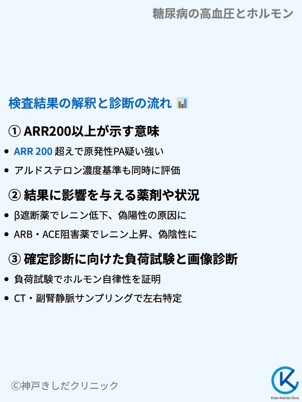 検査結果の陽性判定はARR200以上を目安としますが、薬剤の影響や臨床症状を含めた総合的な判断を経て、確定診断のための負荷試験や画像診断へと進みます。