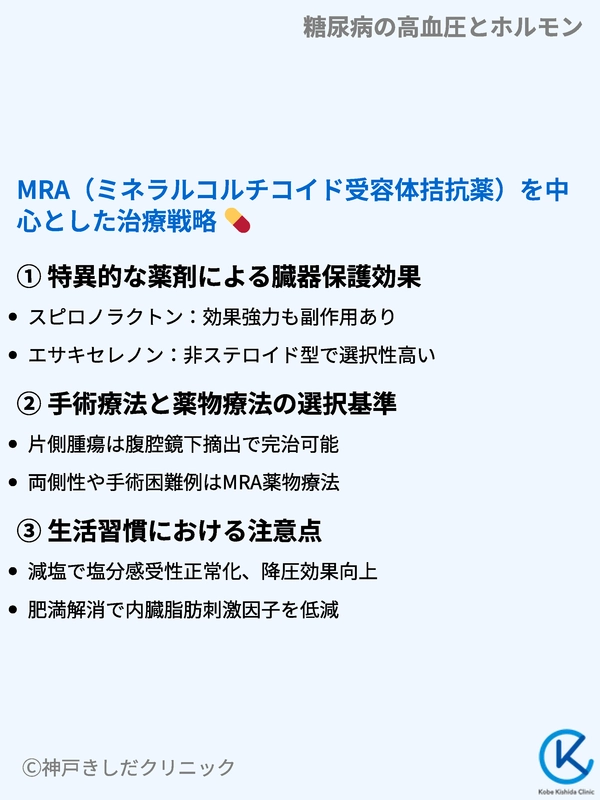 治療の中心となるのは、過剰なホルモンの働きを直接ブロックするMRA(ミネラルコルチコイド受容体拮抗薬)の投与であり、手術適応とならない場合でも高い臓器保護効果を発揮します。