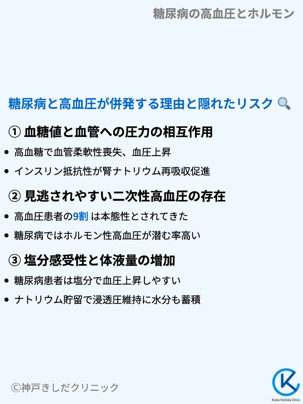 糖尿病と高血圧の併発は、単なる偶然ではなく、高血糖による血管障害や塩分感受性の亢進といった生理学的なメカニズムが深く関与しています。
