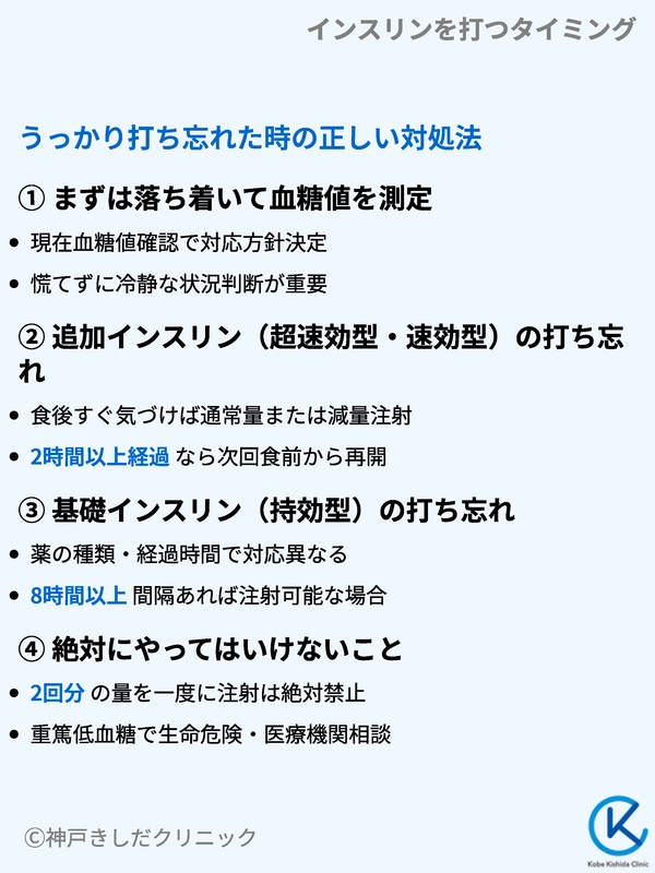 毎日気をつけていても、インスリンを打ち忘れてしまうことは誰にでも起こり得ます。慌てず正しく対処することが大切です。