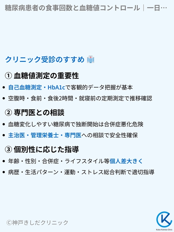 - 定期的な検診で血糖値や合併症リスクをチェック