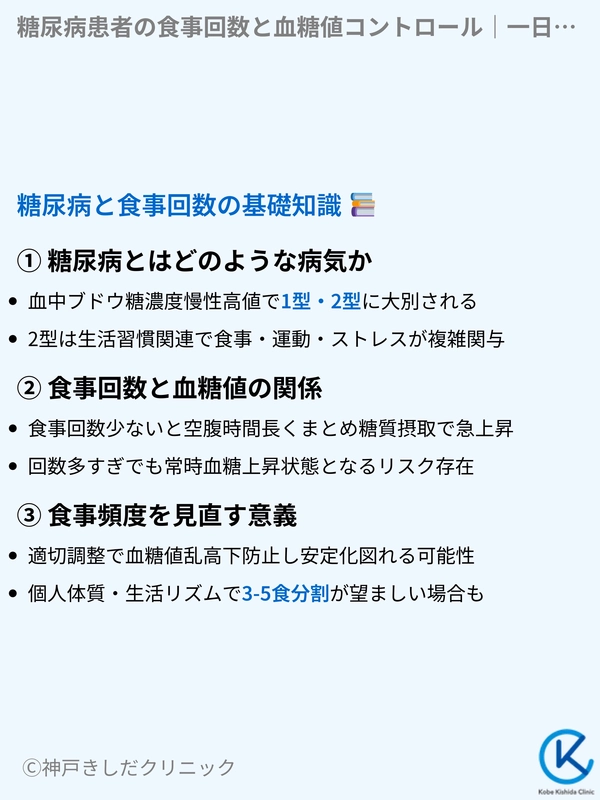 血糖値の急激な変動を防ぎ、安定したコントロールをめざすうえで食事回数の設定は大きな意味を持ちます。