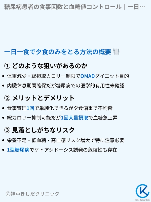 近年、夕食のみとする一日一食(OMAD)がダイエット法として話題になることがありますが、糖尿病治療の標準的手法ではありません。