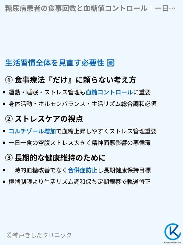 食事回数を減らすだけで血糖値がコントロールできるわけではなく、身体活動量やホルモンバランス、生活リズム全般との調和が不可欠です。