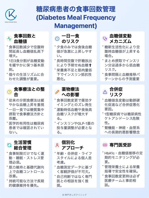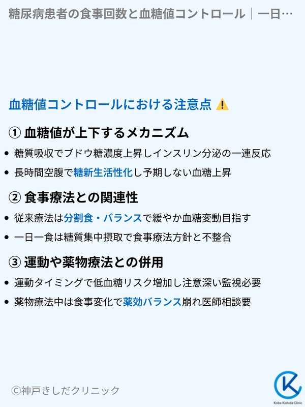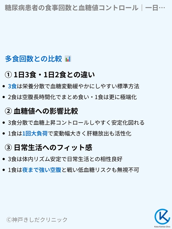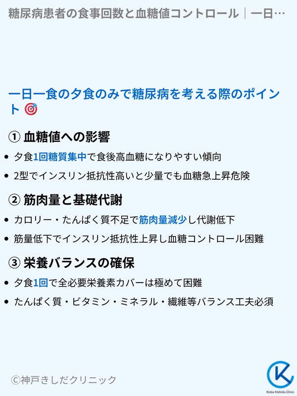 一日一食のように食事回数を極端に減らすと血糖値コントロールがかえって複雑になる可能性があります。