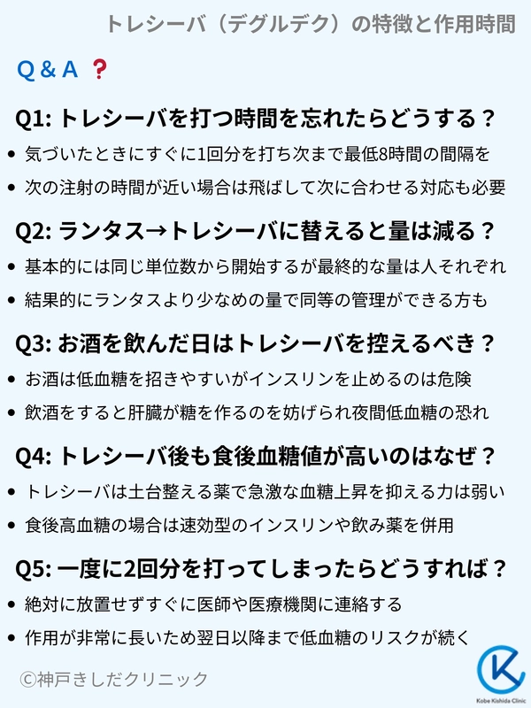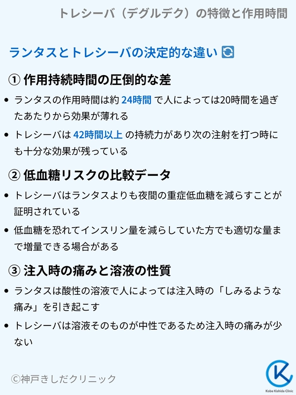 多くの比較試験において、トレシーバはランタスよりも夜間の重症低血糖を減らすことが証明されています。