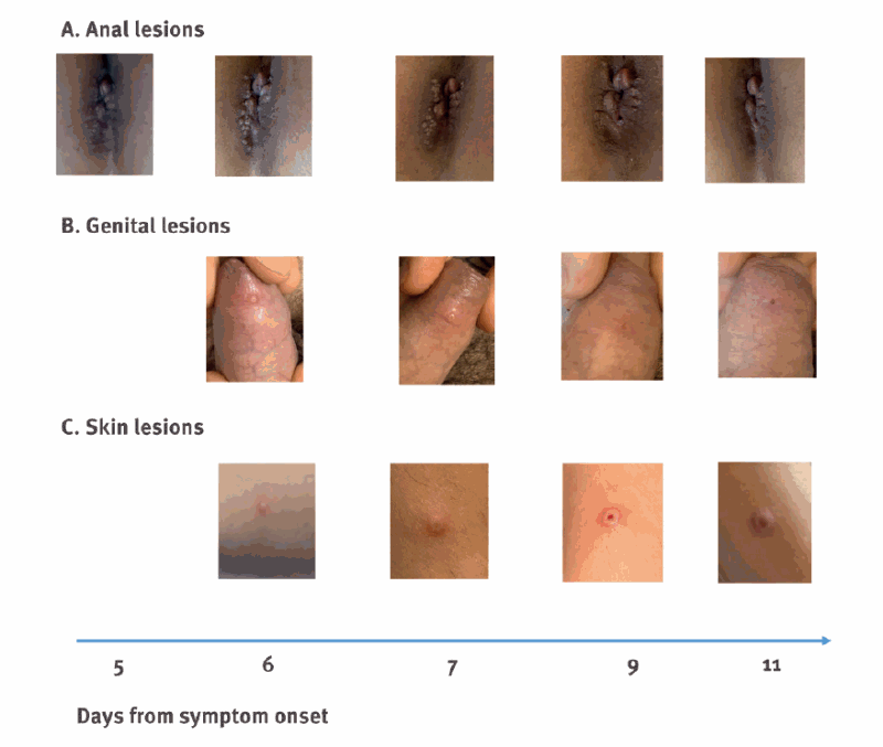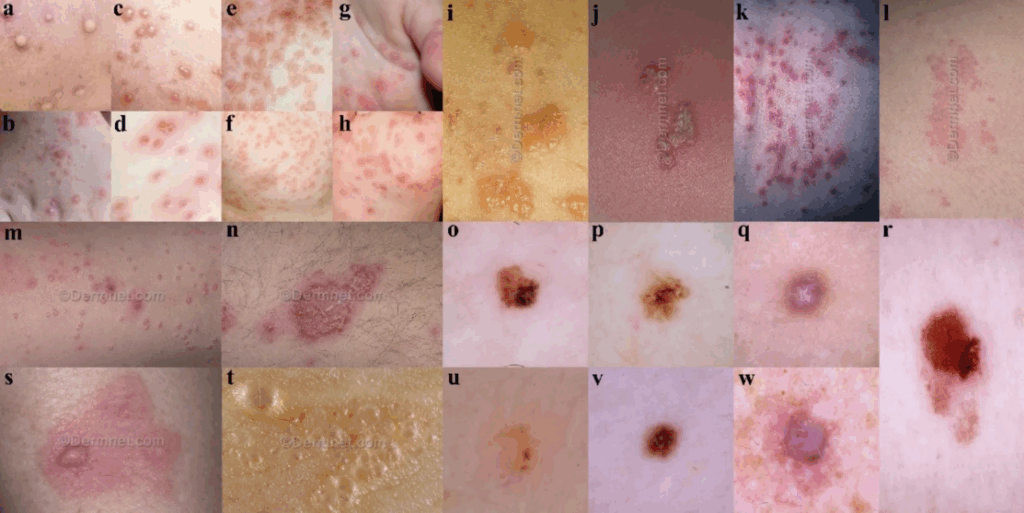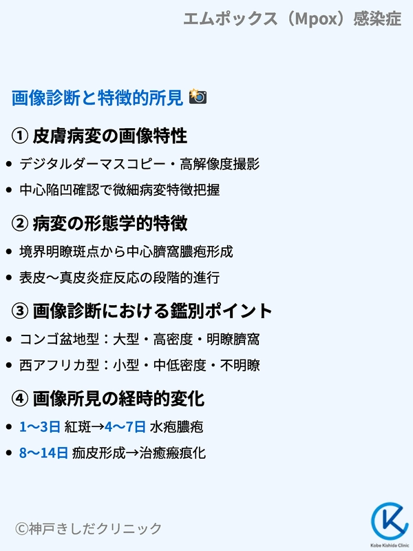 コンゴ盆地型(Clade I)と西アフリカ型(Clade II)では皮膚病変の見た目に体系的な差は確認されていません。どちらの型でも発疹は類似の経過を辿り、中心に臍窩を持つ膿疱を形成します 。