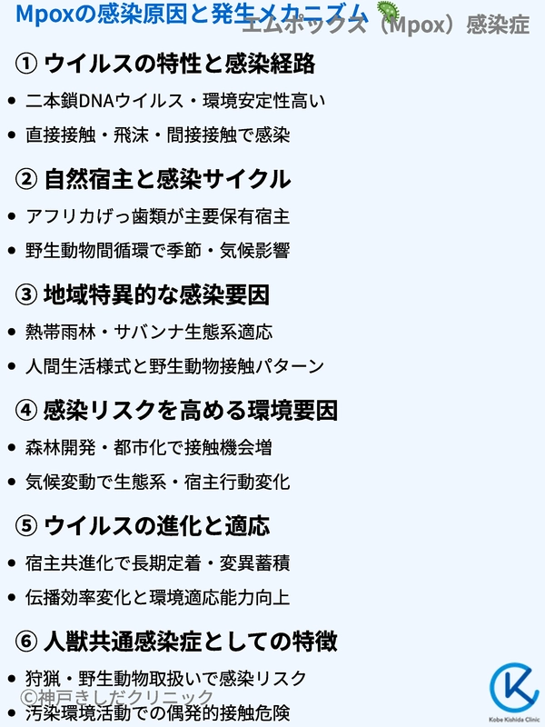 エムポックスはオルソポックスウイルス属に属するサル痘ウイルスによって引き起こされる感染症で、その感染経路や発生メカニズムは複雑な生態学的相互作用を含んでいます。