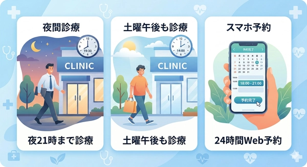 2026年4月より、平日夜21時まで・土曜午後も診療を開始します。