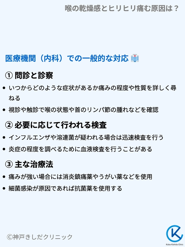 医療機関を受診すると、医師は症状や経過を詳しく聞き、喉の状態を診察します。必要に応じて検査を行い、原因に応じた治療を行います。