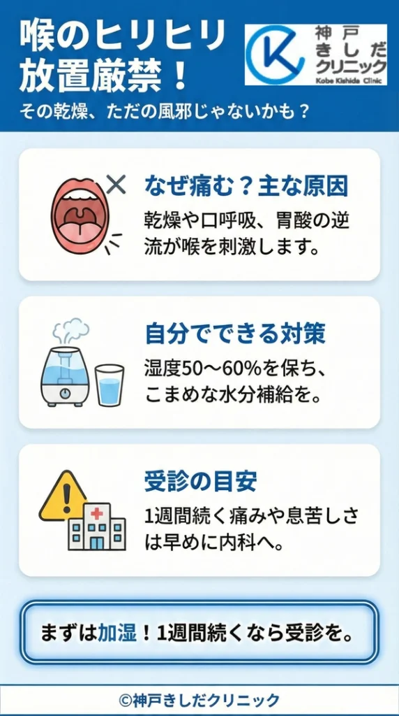 耳鼻咽喉科や呼吸器内科で相談し、適切なアドバイスや治療を受けることをお勧めします。加湿やこまめな水分補給といったセルフケアも継続して行いましょう。