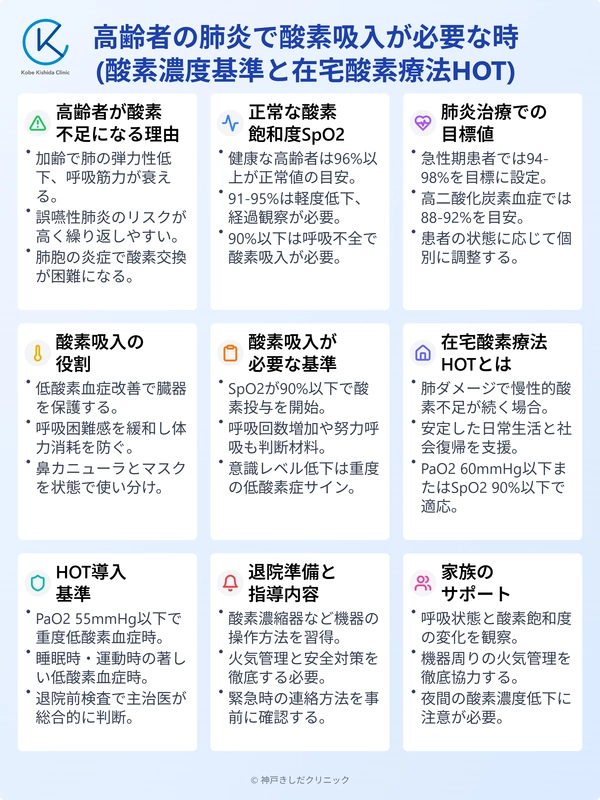 この記事ではなぜ高齢者の肺炎で酸素吸入が必要になるのか、正常な酸素濃度はどのくらいなのか、そしてどのような場合に在宅酸素療法(HOT)へ移行するのか、その基準や注意点を分かりやすく解説します。