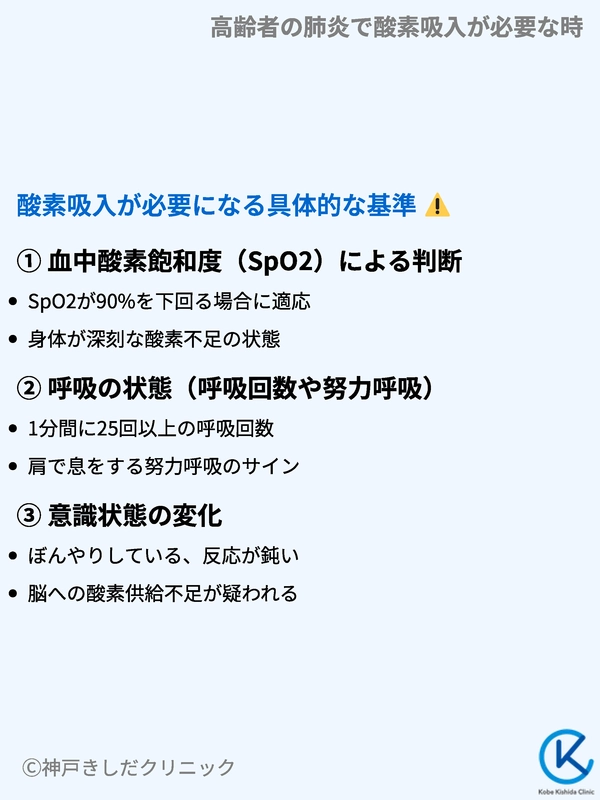 最も重要な基準は血中酸素飽和度(SpO2)です。一般的に安静にしている状態でSpO2が90%を下回る場合、酸素吸入の適応となります。