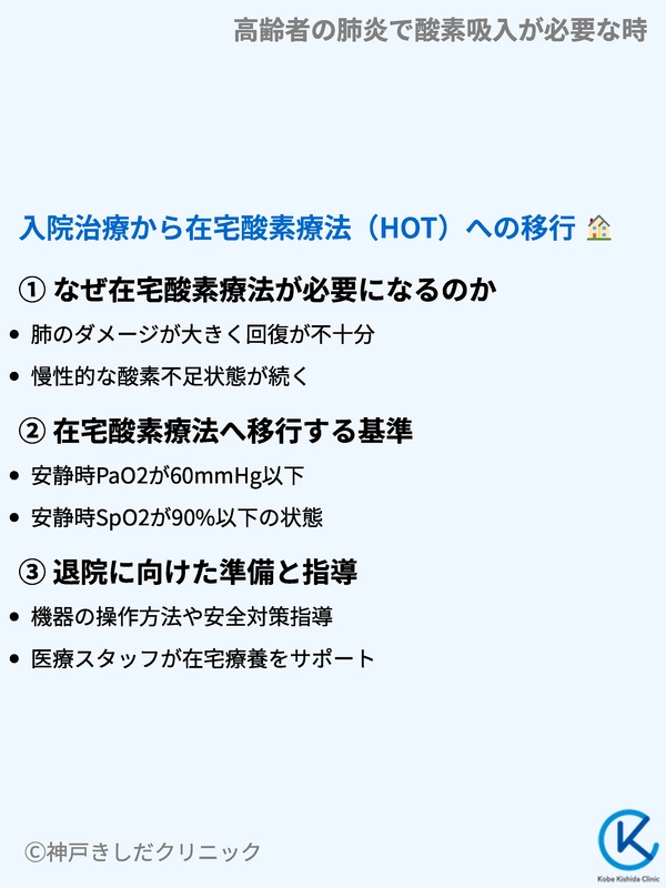 しかし肺炎をきっかけに呼吸機能の低下が顕著になり、慢性的な酸素不足が残ってしまうことも少なくありません。その場合は継続して在宅酸素療法が必要になります。