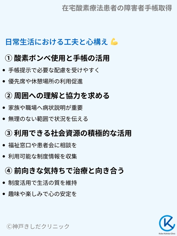 在宅酸素療法を行いながら、また障害者手帳を利用しながら日常生活を送る上で、いくつかの工夫や心構えが大切になります。