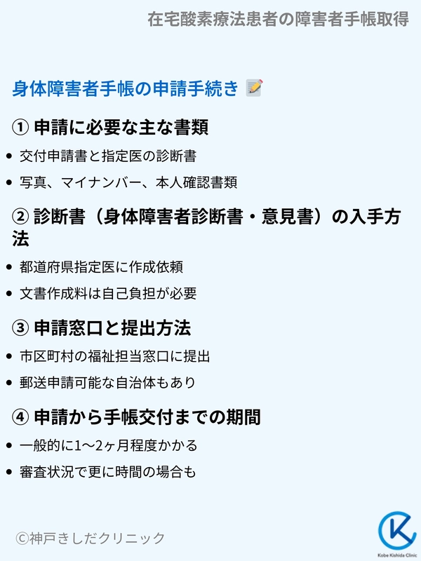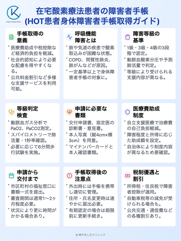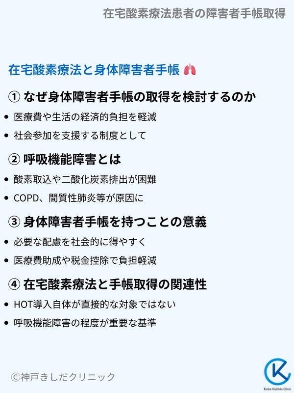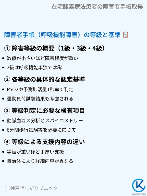 在宅酸素療法を受けていること自体が直ちに障害者手帳の交付に結びつくわけではありません。重要なのは呼吸機能の障害の程度です。