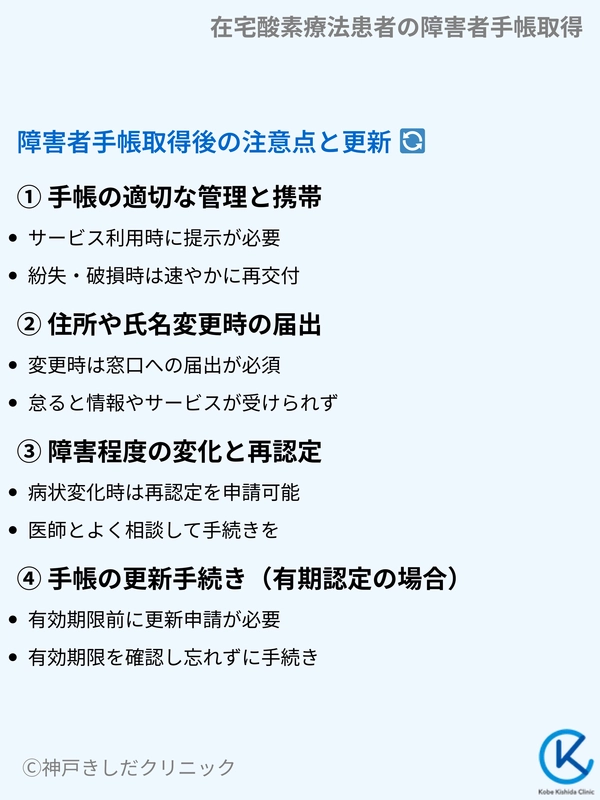 身体障害者手帳を取得した後もいくつかの注意点があり、また、障害の状態によっては更新手続きが必要になる場合があります。