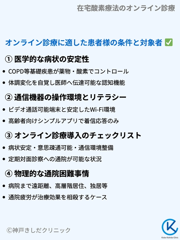 頻繁に酸素流量の調整が必要な時期や、感染症を併発して発熱しているような急性期は、対面での詳細な診察が優先されます。