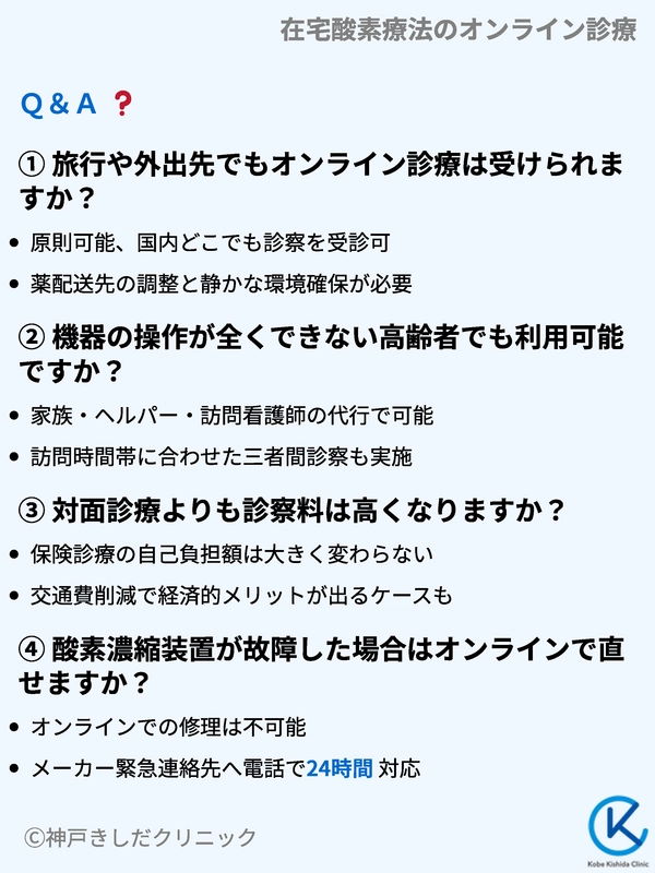 | 移動の負担 | 酸素ボンベ携帯が必須で身体的負荷大 | 対面診療月以外は移動ゼロで負荷なし |