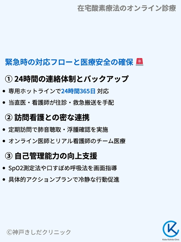 患者様が安心して在宅酸素療法を継続するためには、単にビデオ通話がつながるだけでなく、背景にある「セーフティネット」が機能していることが重要です。
