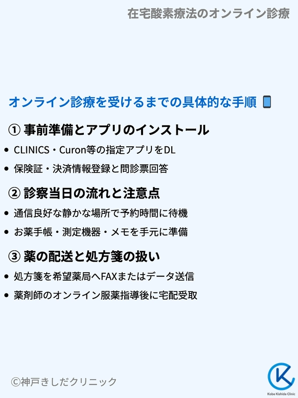 オンライン診療では、画面を通じてSpO2の正しい測り方や、息切れ時の呼吸法(口すぼめ呼吸など)、吸入薬の正しい操作方法を指導します。