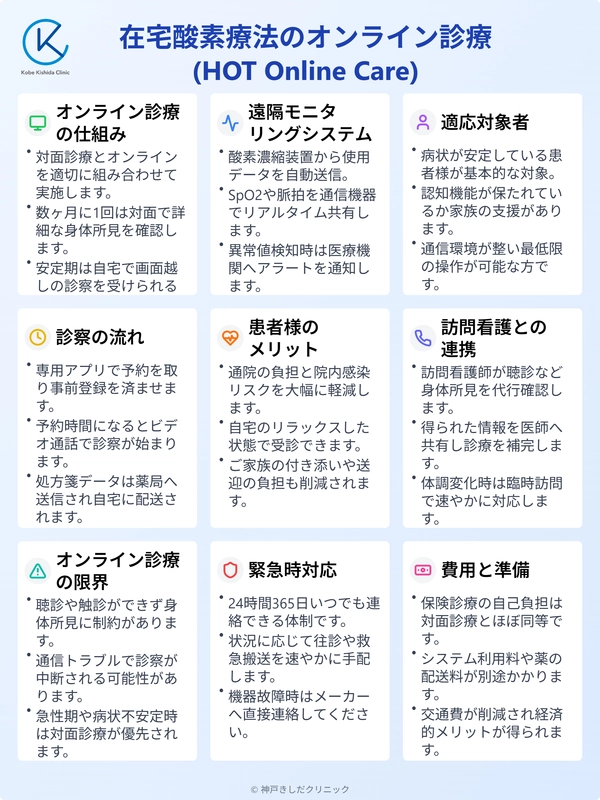 現在の医療制度において、在宅酸素療法(HOT)を受けている患者様が自宅にいながら医師の診察を受けることは認められています。
