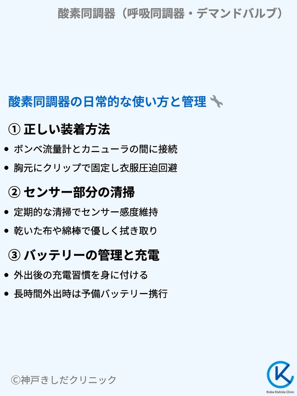 酸素同調器の効果を最大限に引き出し、安全に使用するためには日々の正しい使い方と管理が重要です。