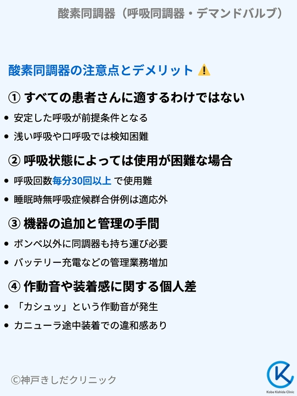 多くのメリットがある一方で、酸素同調器にはいくつかの注意点や限界もあります。すべての方に適しているわけではないため、導入前によく理解しておくことが大切です。