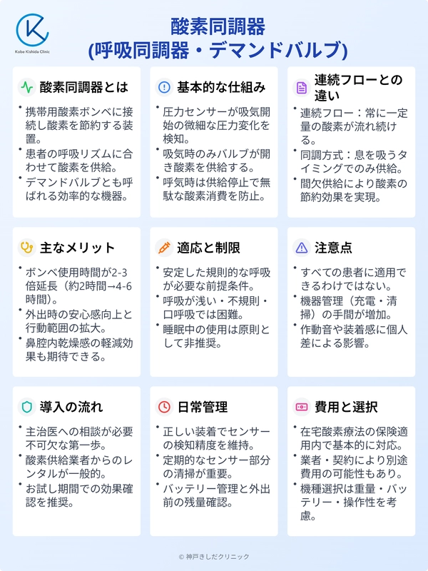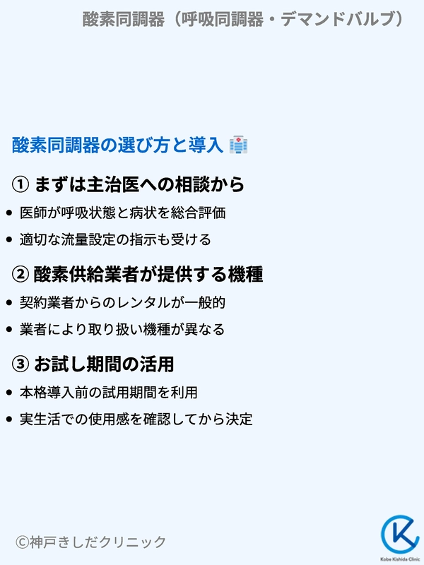 酸素同調器の使用を希望する場合、必ず主治医に相談してください。医師は患者さんの呼吸状態や病状を総合的に評価し、同調器の使用が適切かどうかを判断します。