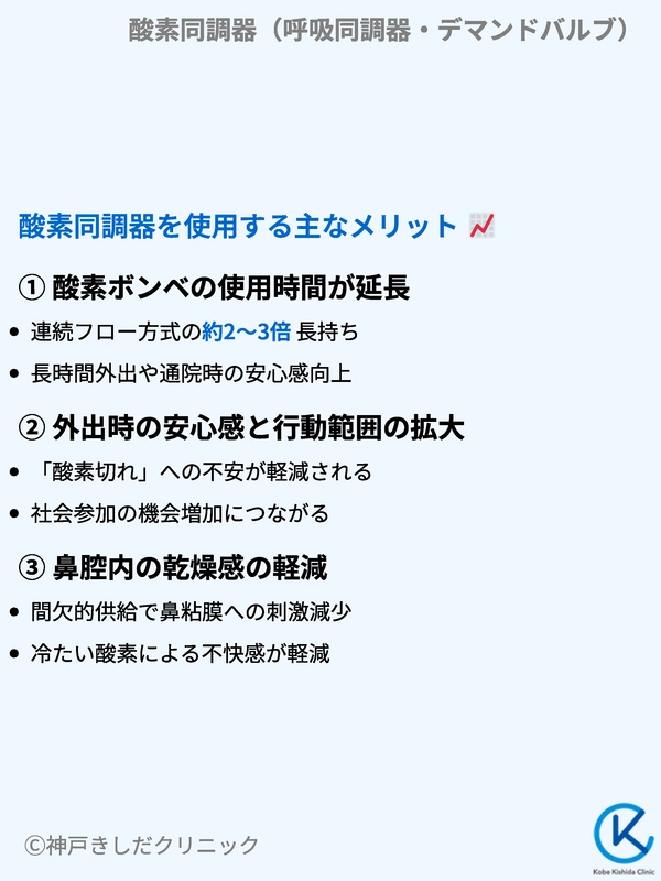最大のメリットは酸素ボンベの使用時間が大幅に延びることです。