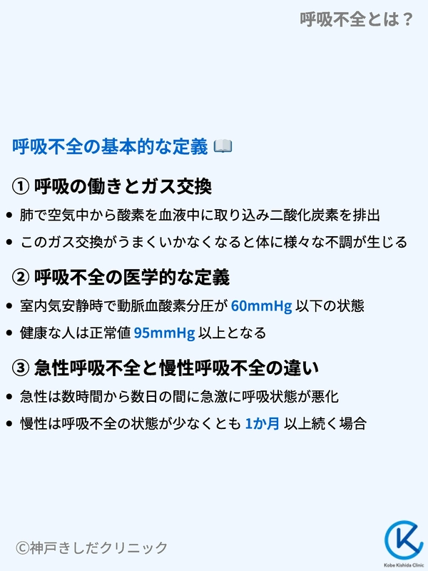 医学的には「呼吸機能の障害によって体に必要な酸素を取り込み、不要な二酸化炭素を排出する能力が不十分になった状態」と定義します。