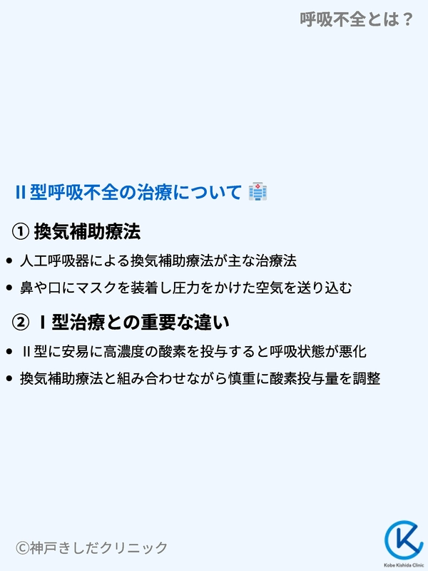 これは呼吸を促す刺激が弱まり、さらに二酸化炭素が溜まってしまうためです。このため、Ⅱ型の治療では換気補助療法と組み合わせながら慎重に酸素投与量を調整する必要があります。