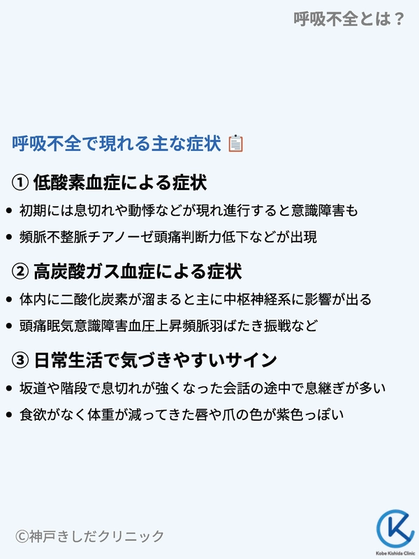 息を吸ったり吐いたりする力が弱まることで酸素を取り込めないだけでなく、二酸化炭素を十分に排出できなくなってしまう状態です。