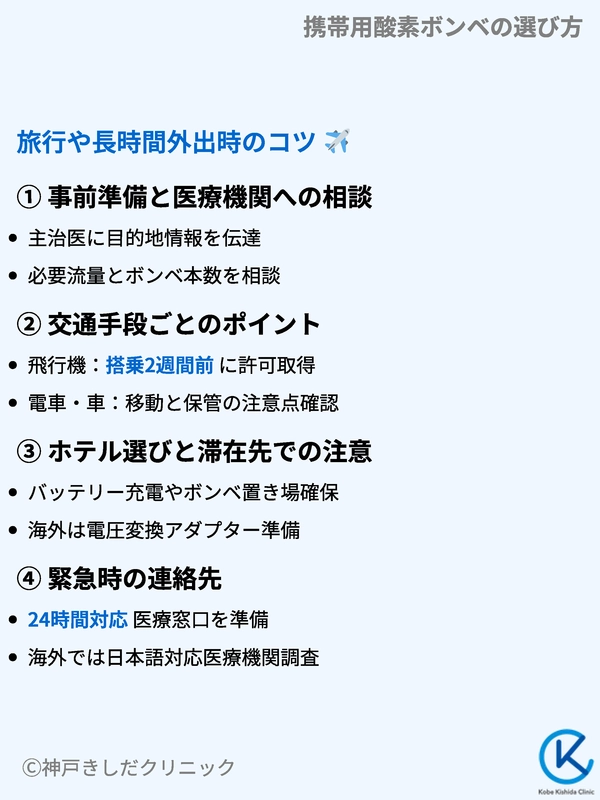 旅行や遠出の予定が決まったら、まず主治医に相談してください。目的地の気候や標高、移動手段などを伝えれば、必要な流量やボンベ本数の目安を一緒に考えられます。