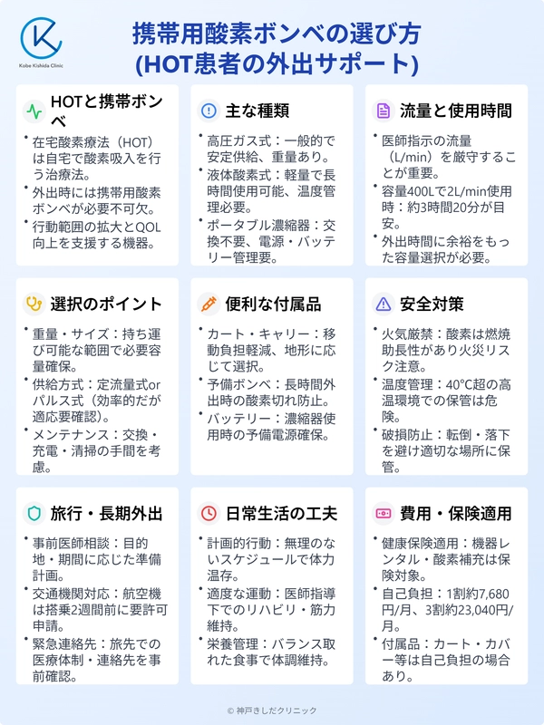 外出を考慮した酸素ボンベを携帯する場合、HOTの特徴や携帯用酸素ボンベの役割を把握しておくことが重要です。
