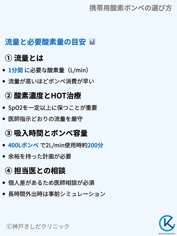 流量や酸素量を理解しておかないと外出時に酸素が足りなくなったり、逆に過剰な設備を用意して持ち運びが困難になったりするリスクがあります。