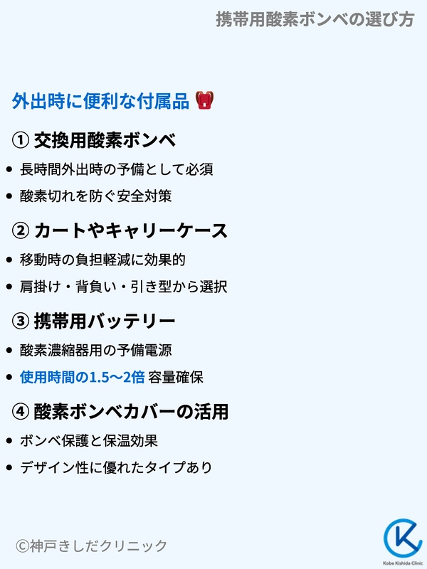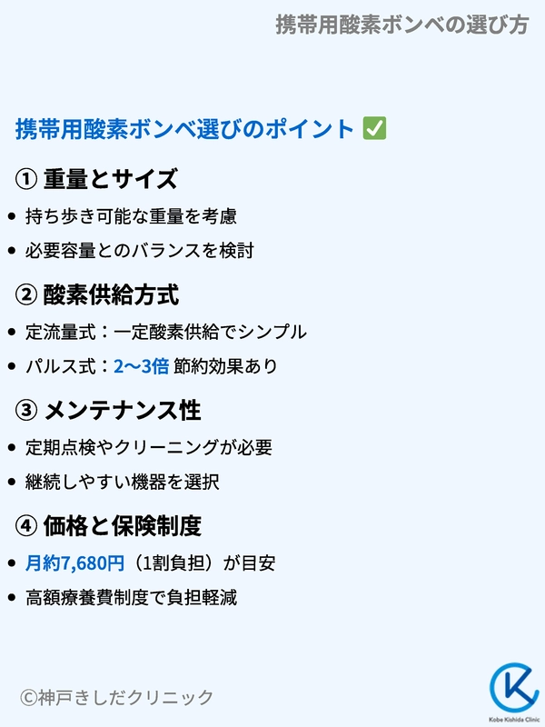 携帯用の酸素ボンベを選ぶときには重量やサイズだけでなく、酸素供給方式やメンテナンスのしやすさ、価格など多岐にわたる項目を考慮します。
