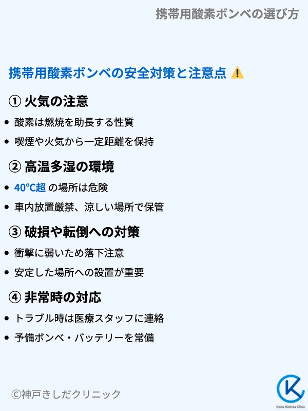 携帯用の酸素ボンベは取り扱いを誤ると事故やトラブルが起こる可能性があります。特に火気や高温環境などには十分気をつける必要があります。