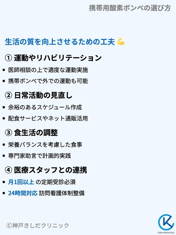 携帯用酸素ボンベの準備だけでなく、日常生活のさまざまな面を見直すことで呼吸機能や体力の維持にもつなげられます。
