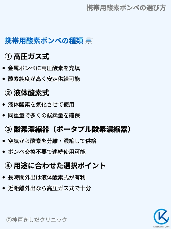 それぞれの形式にメリットとデメリットがあります。医療機関で指示された酸素流量や自身の体力、行動範囲などに応じて選ぶことが大切です。