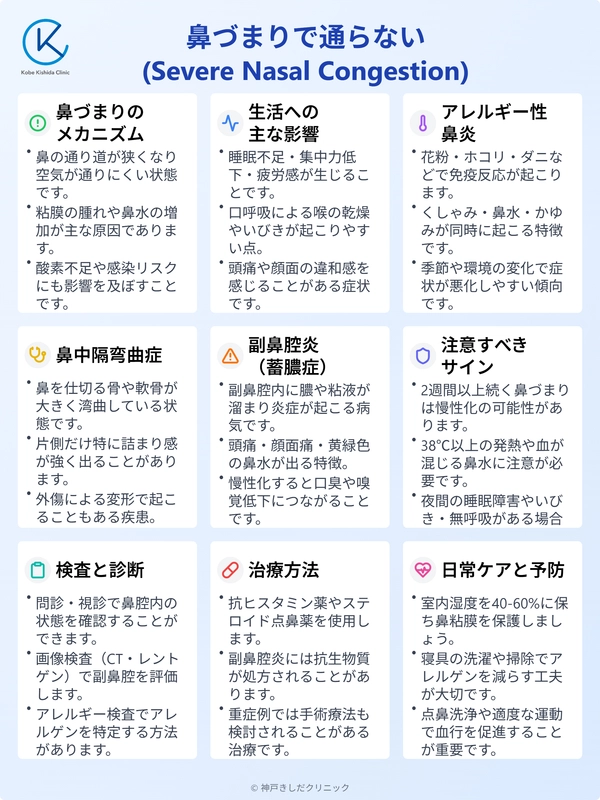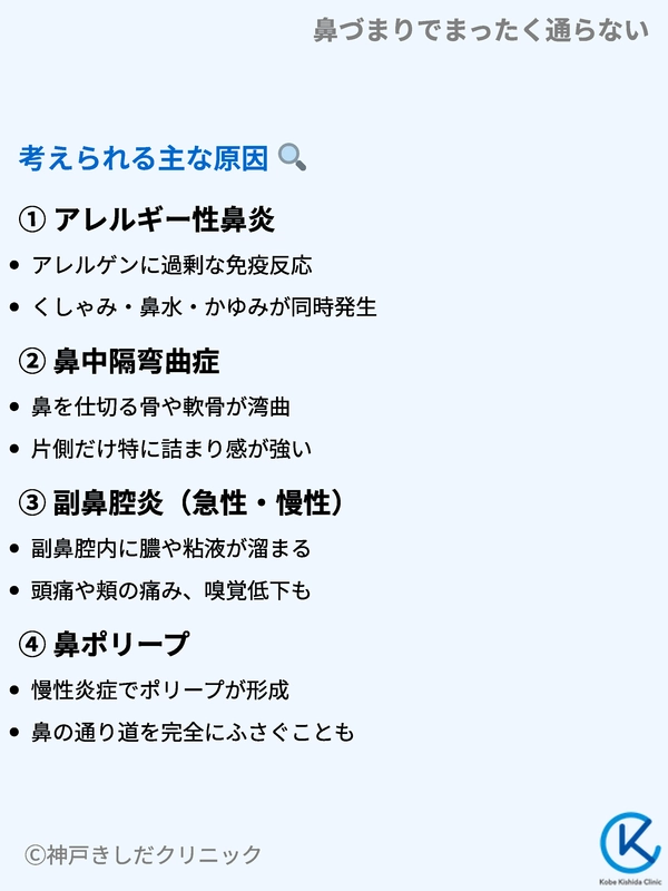 鼻づまりがまったく通らないときには、さまざまな要因が隠れている可能性があります。ここでは主な原因として挙げられる疾患や体質面の問題を見ていきます。