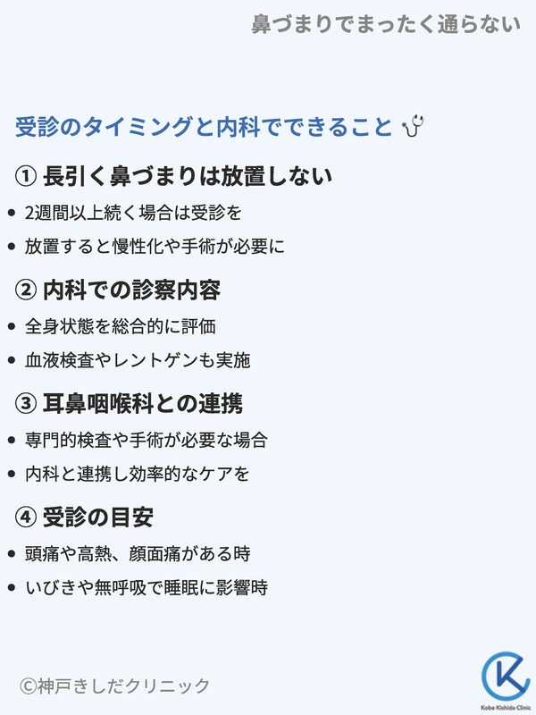 鼻づまりとともに頭痛や高熱、顔面痛などの症状があるときや、いびき・無呼吸など睡眠に影響を与えている場合は早期受診を検討してください。