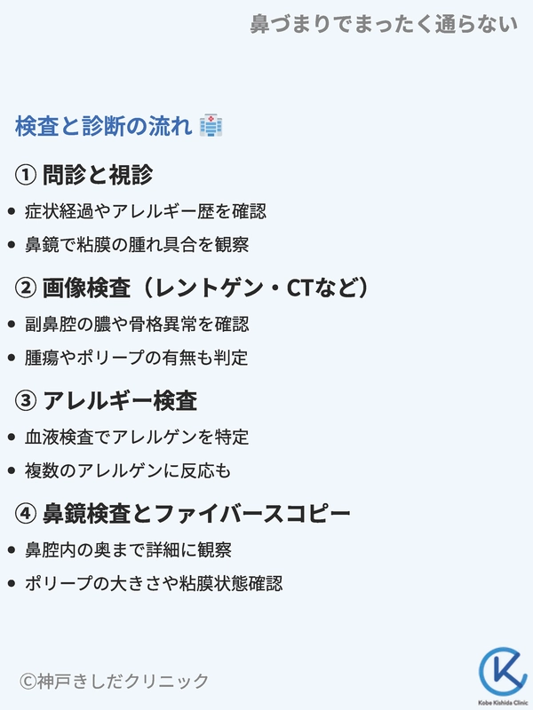 鼻づまりがまったく通らない状態が続く場合、原因を特定するための検査や診断は欠かせません。ここでは内科や耳鼻咽喉科で行われる主な検査方法や、その流れを確認しておきましょう。