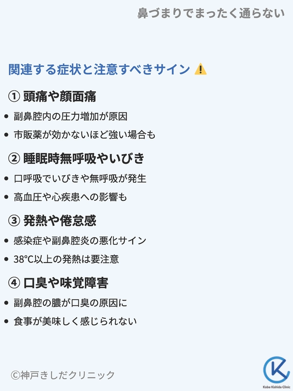 鼻づまりがひどい場合、単に息苦しいだけでなく、他の症状を併発することが多いです。ここでは、鼻づまりに伴いやすい症状と、その中でも特に注意が必要なサインを紹介します。