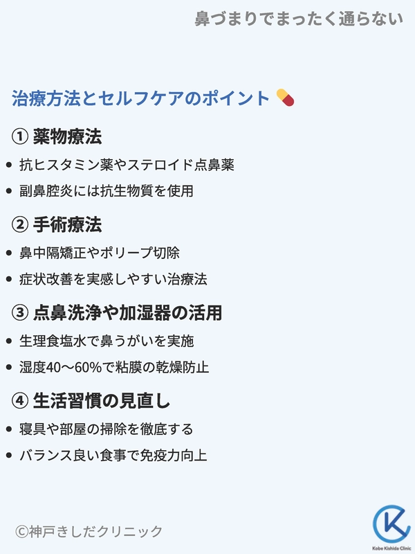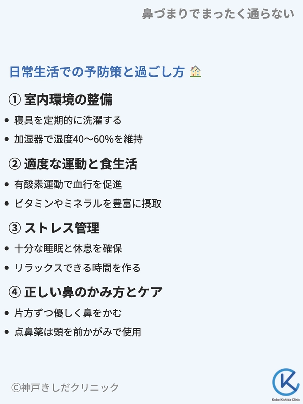 鼻づまりを繰り返さないためには、日常生活での予防策や環境整備が大切です。小さな工夫の積み重ねが鼻の健康を守り、慢性的な症状を防ぐことにつながります。