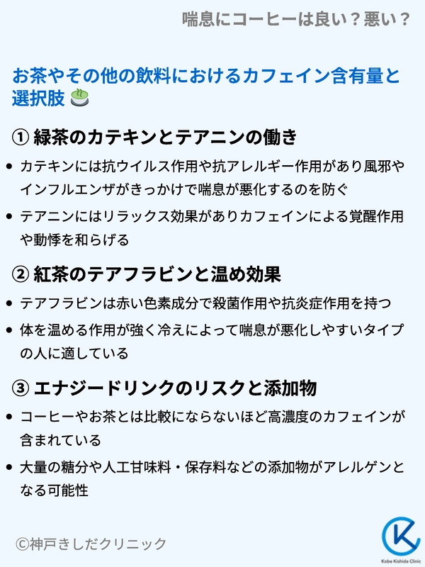 それぞれの飲み物にはカフェイン以外の成分も含まれており、喘息への影響も異なります。自分の体質や生活スタイルに合った飲み物を選ぶことが大切です。