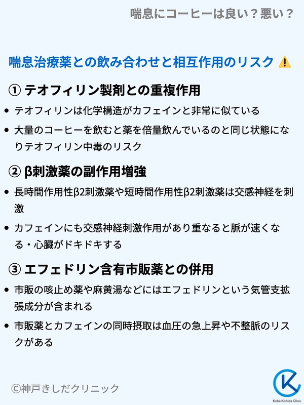 喘息の治療を受けている方が最も注意しなければならないのは、処方薬とカフェインの相互作用です。