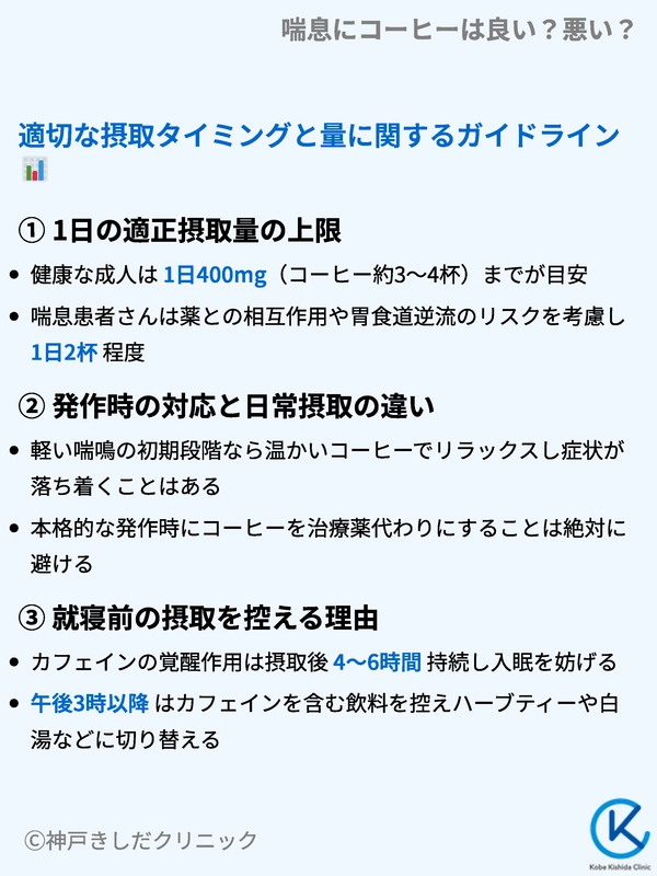 | 喘息患者(薬なし) | 200〜300mg(約2〜3杯) | 胃酸逆流や睡眠への影響を考慮して控えめに。 |